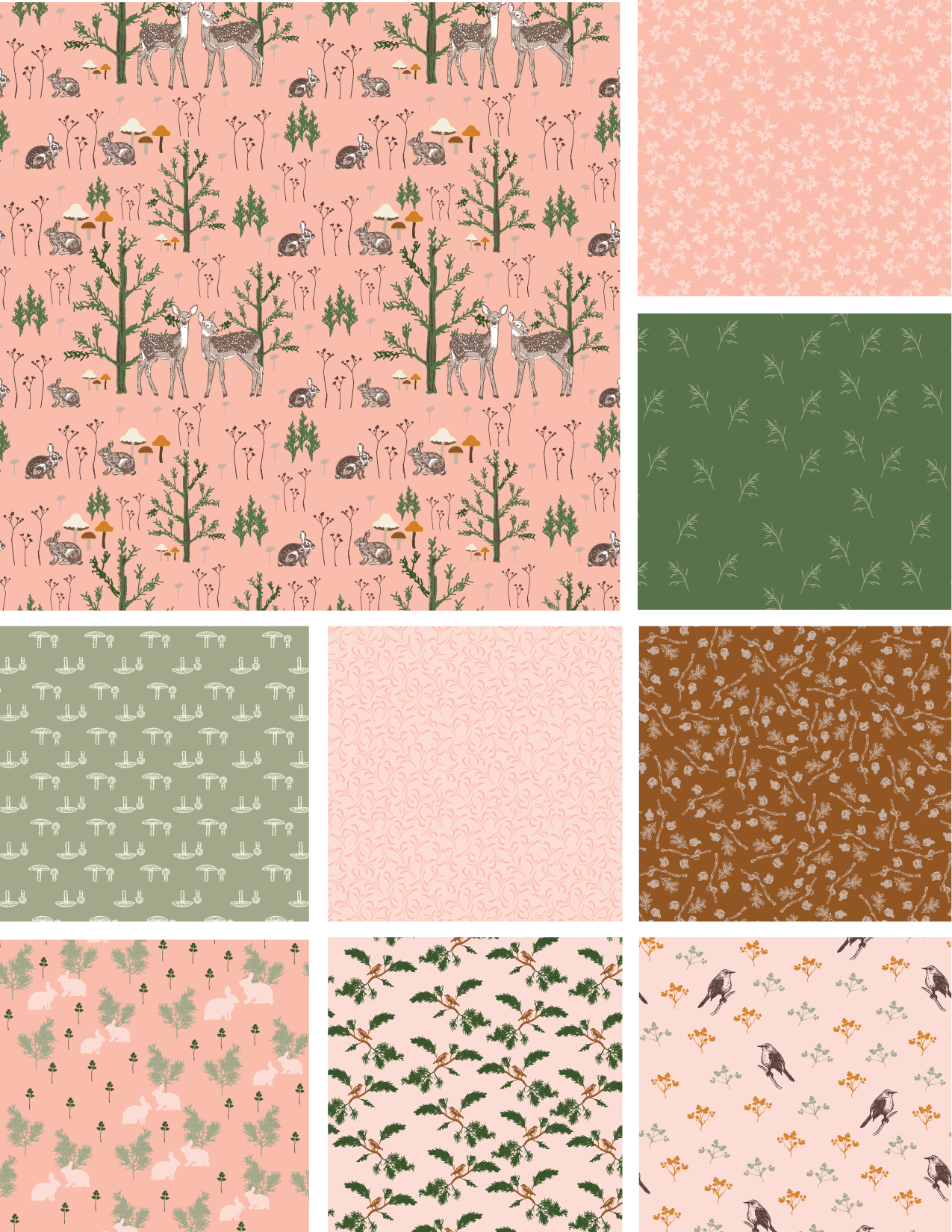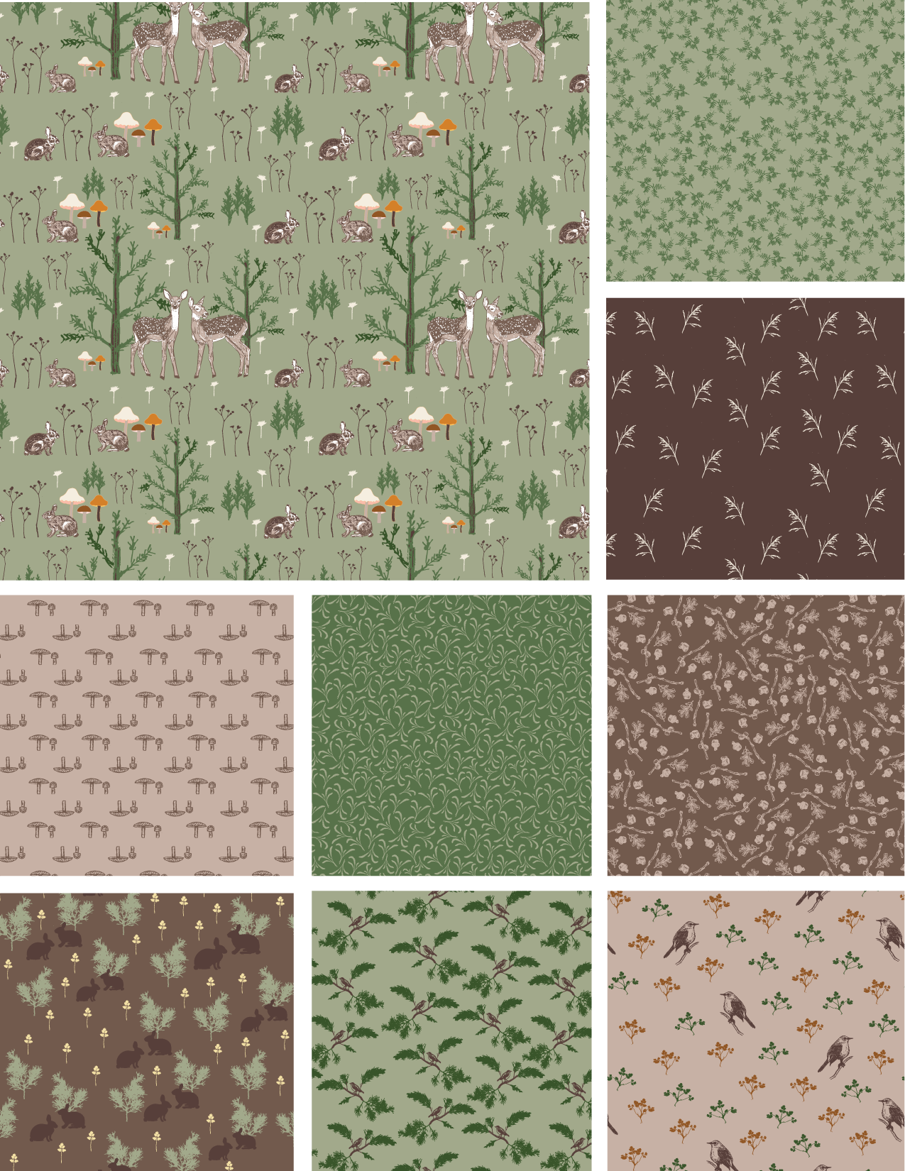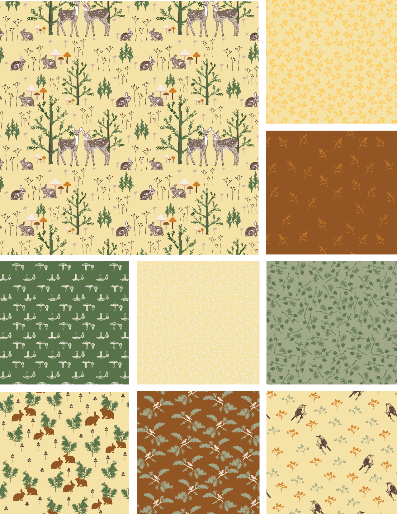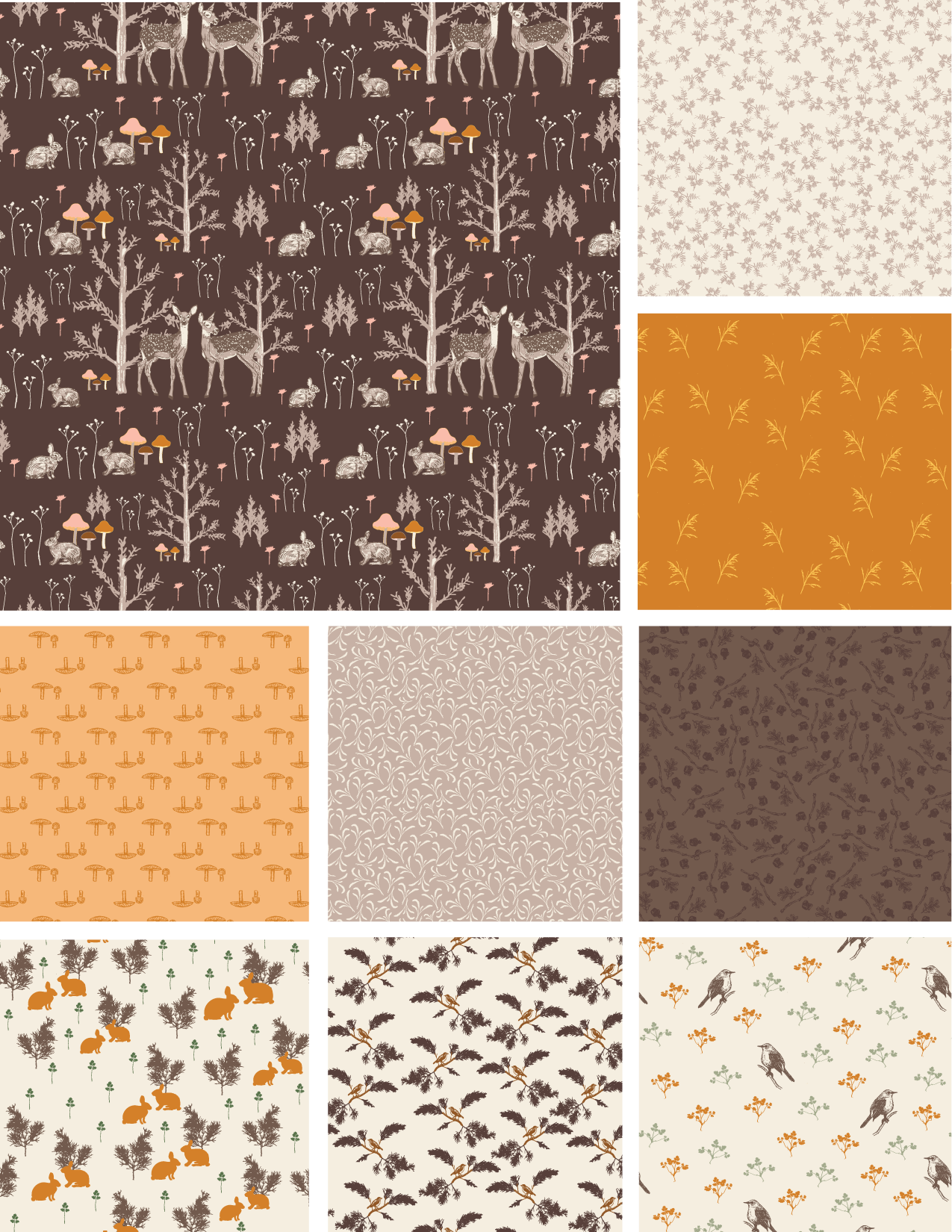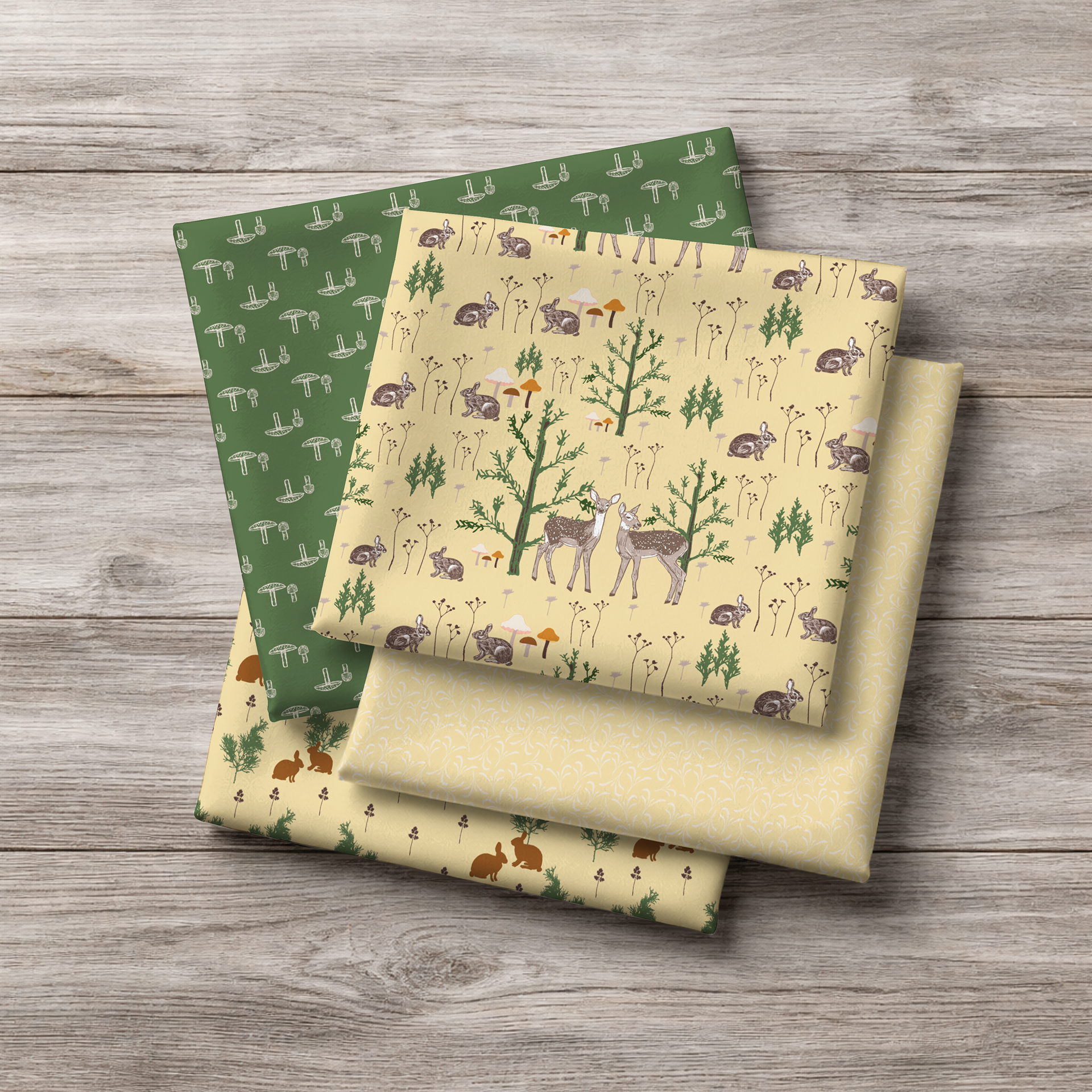Juniper & Friends is a cozy woodland collection inspired by juniper trees, delicate forest flora, and the gentle wildlife that wanders through each season. Featuring fawns, cottontail rabbits, birds, and mushrooms in earthy, muted tones, these nostalgic prints are perfect for quilting and timeless home décor projects.