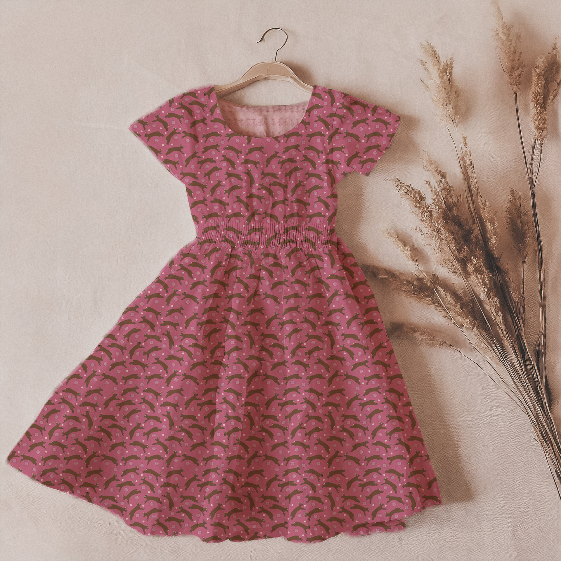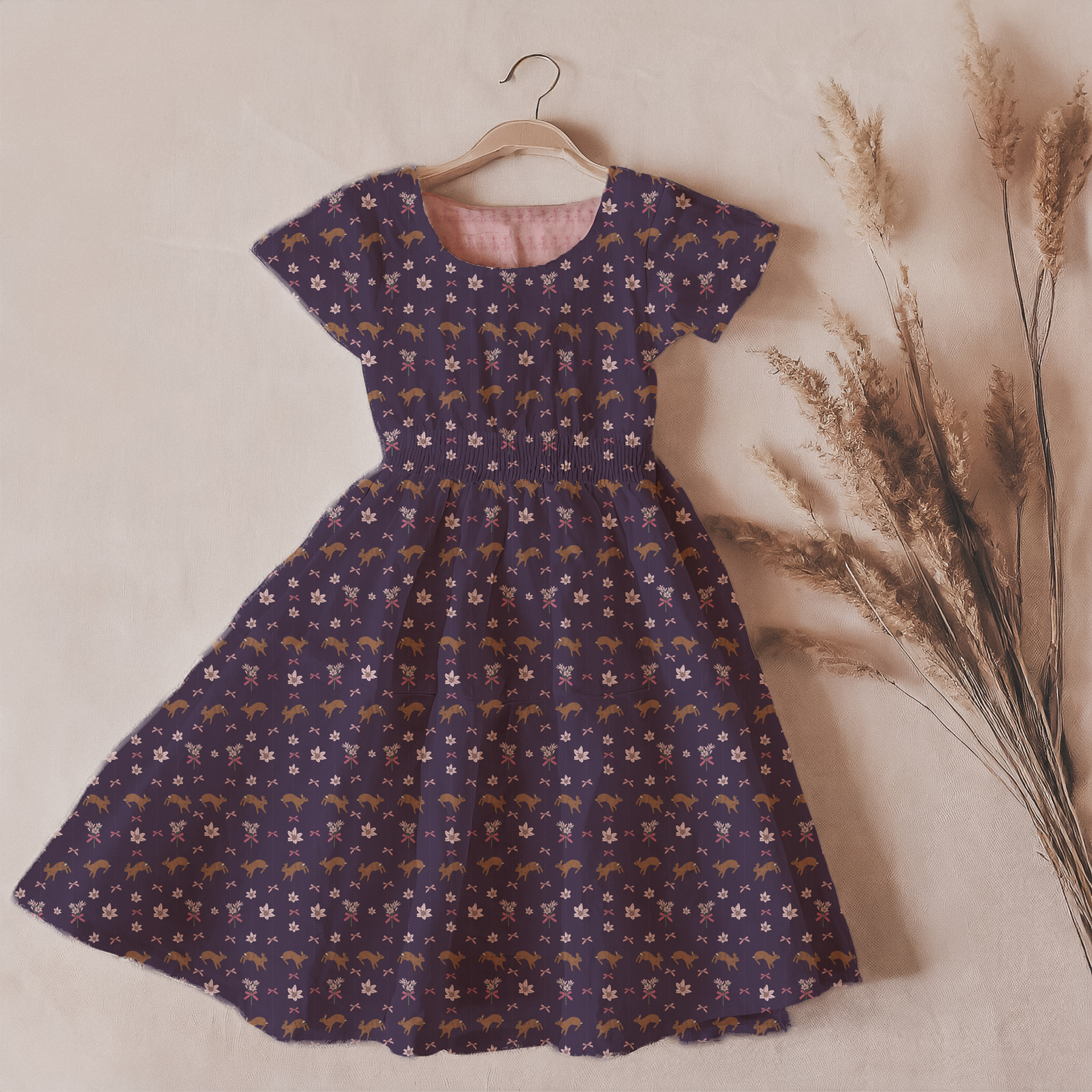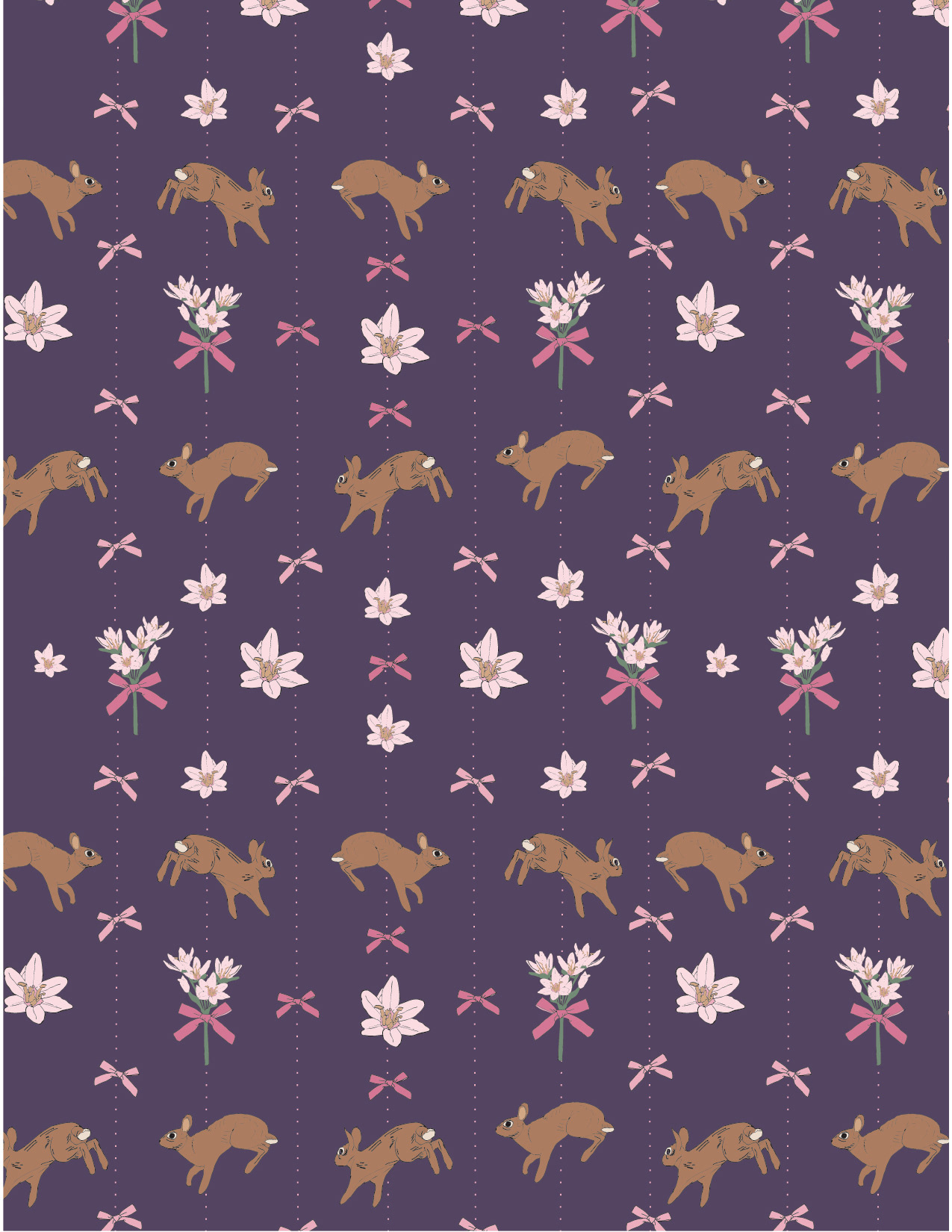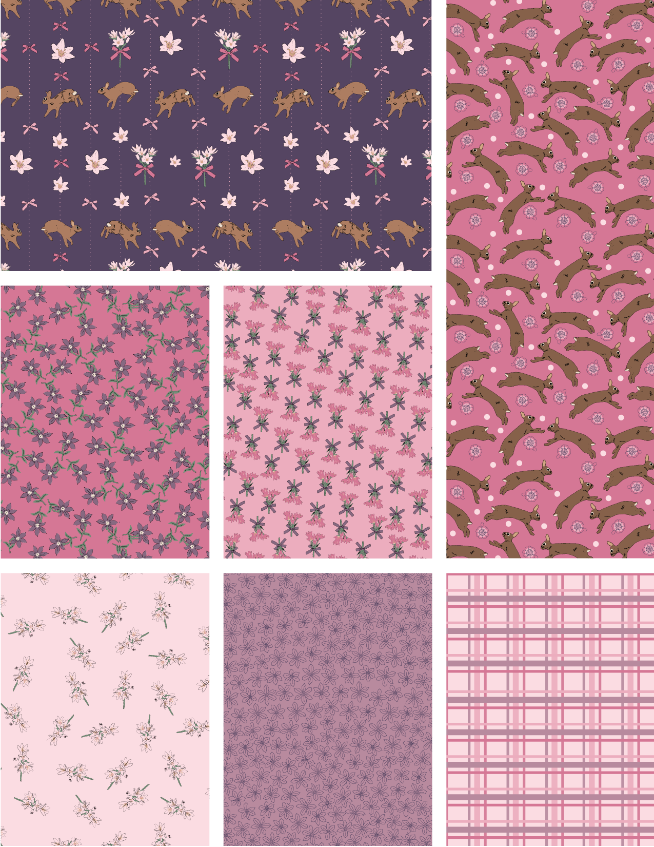 Playful cottontails leap through blooming wildflowers, bringing softness and movement to the heart of the collection. Layered florals and a nostalgic pastel plaid create warmth and harmony throughout.